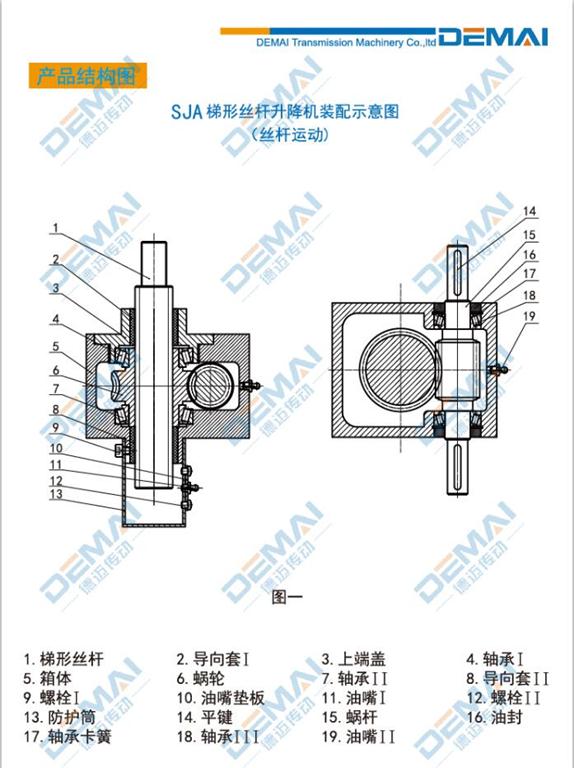 今天德迈传动为大家展示一下丝杆升降机的内部结构示意图,让大家更明确的了解我公司生产的丝杆升降机。